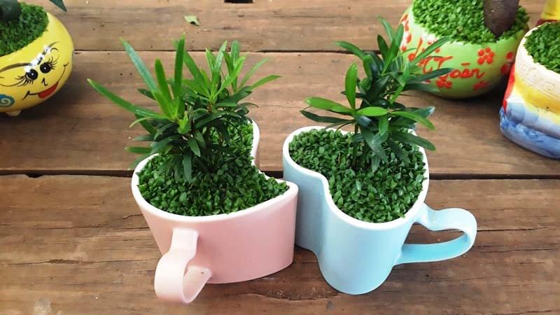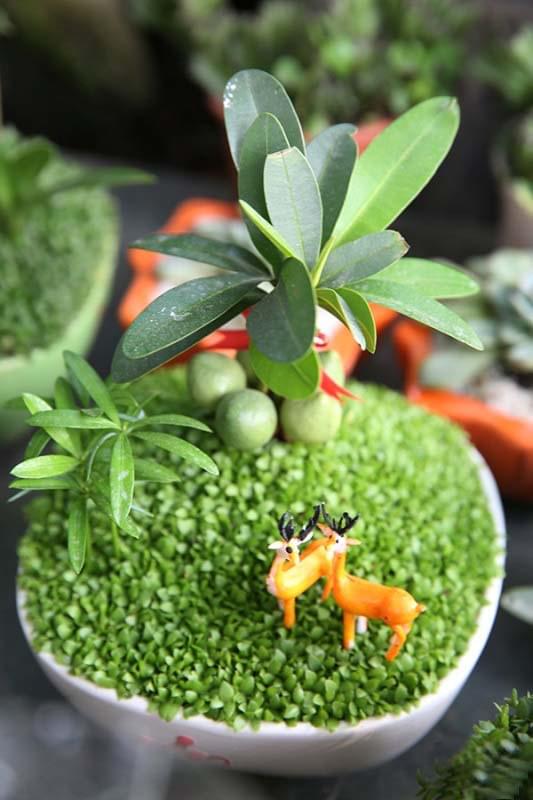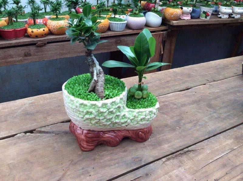 - Cây may mắn được trồng trong chậu sứ với lớp cỏ xanh mướt phía dưới, dáng đẹp, giúp không gian quanh bạn thêm sinh động, đẹp mắt.