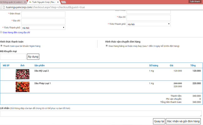 Bước 6: Sau khi đã cập nhật đầy đủ thông tin đặt hàng (email, tên người nhận hàng, địa chỉ, số điện thoaị - ở hình 7), bạn nhấn tiếp nút "Gửi và xác nhận đơn hàng ở hình 8" để kết thúc quá trình đặt hàng.