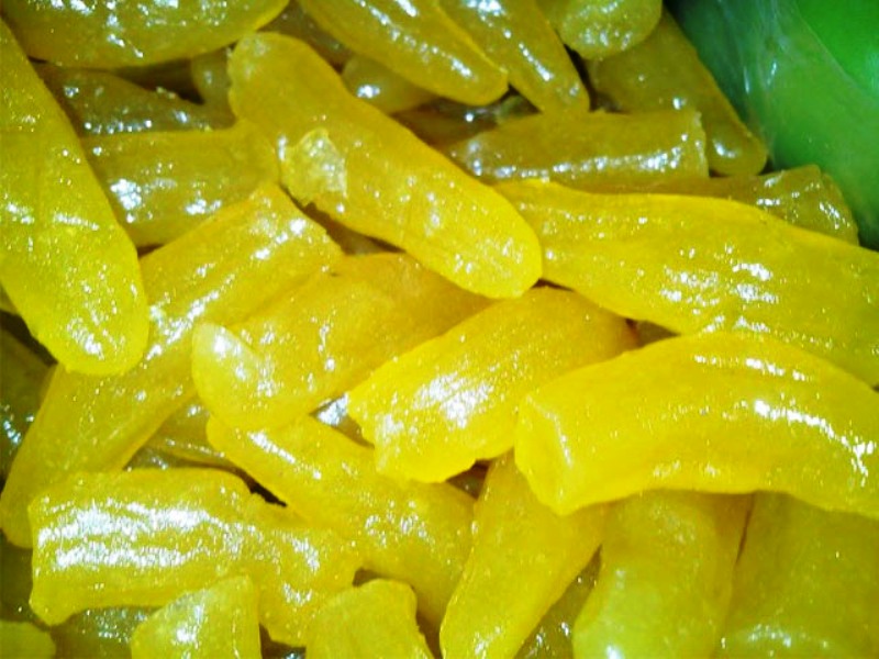 Mứt khoai lang sâm của Đà Lạt dẻo và thơm lừng. Miếng mứt khoai lang chỉ vừa bằng ngón tay út, bóng mượt vàng ươm màu của khoai. Khoai lang sâm thơm dẻo là một trong những món đặc sản của Đà Lạt.