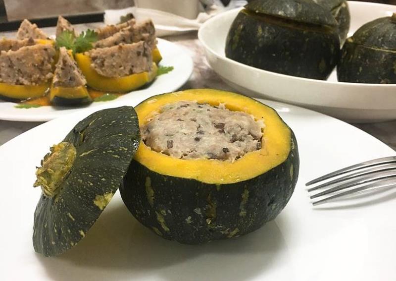 Bí ngô non hầm nước dừa cũng ngon và khá lạ miệng. Bí thái lát dày, cho vào nồi, thêm đậu phộng giã nhỏ rồi hầm với nước dừa non cho đến khi bí chín mềm, nêm gia vị vừa ăn rồi tắt bếp. Món ăn hấp dẫn với lát bí chín mềm thấm đẫm vị ngọt thơm của nước dừa cùng cái beo béo của đậu phộng, được dùng như món canh trong những bữa cơm gia đình.