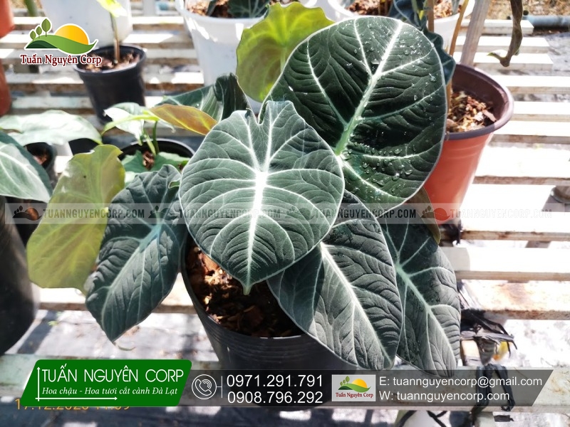 Tránh nắng trực tiếp, có thể làm cháy lá môn Black Velvet. Tôi đặt các chậu môn bên dưới lưới lan giảm 60% nắng. Các chậu được kê lên giàn cao ráo, không bị đọng nước khi tưới hoặc khi trời mưa.