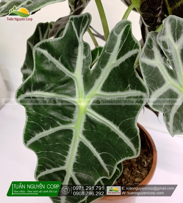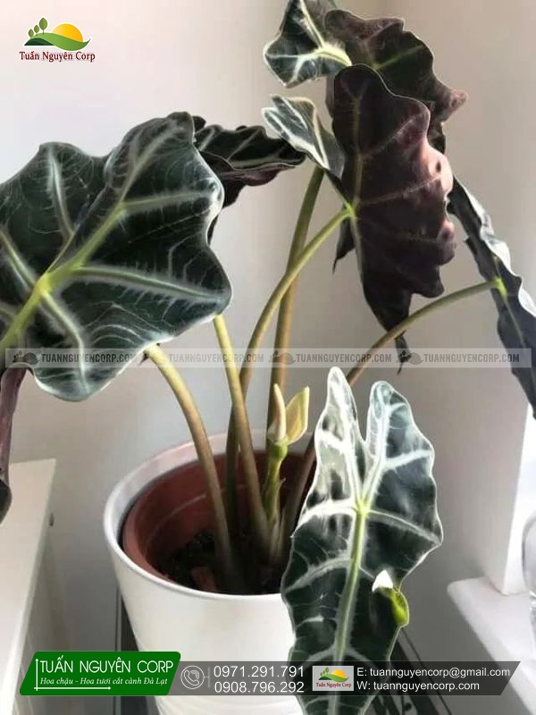 Nguồn gốc: Lai của Alocasia longiloba x Alocasia sanderiana. (Cây bố mẹ đến từ châu Á nhiệt đới)