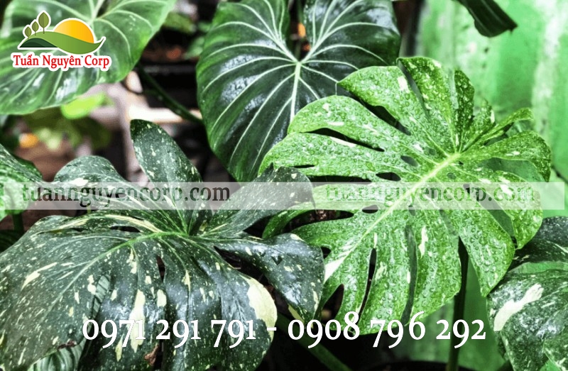 Lá có cuống dài mọc ra từ thân, có màu lục thẫm, mặt lá bóng, phiến lá có thể to và dài đến 60cm, có các vết xẻ sâu vào cuống lá, chia thùy dạng lông chim. Ngoài ra Trên bề mặt lá có khi có các lỗ hình ovan phân phân bố giữa gân lá chính và phần xẻ. Ở một số cây đột biến, lá sẽ có một nửa bên màu trắng, một nửa bên màu xanh.