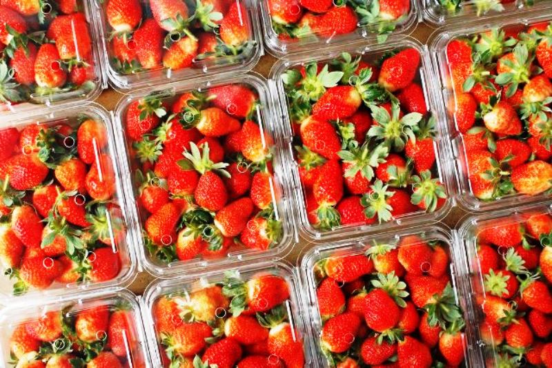 Dâu tây được hái từ vườn vào, ta lựa dâu đạt tiêu chuẩn cho vào hộp 1kg hoặc 2kg rồi đóng nắp và buộc dây cho hộp dâu. Sau đó, ta cho vào thùng đóng, ghi tên người nhận và số điện thoại liên lạc.