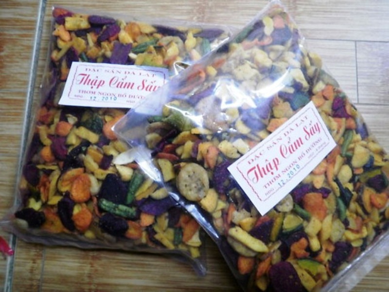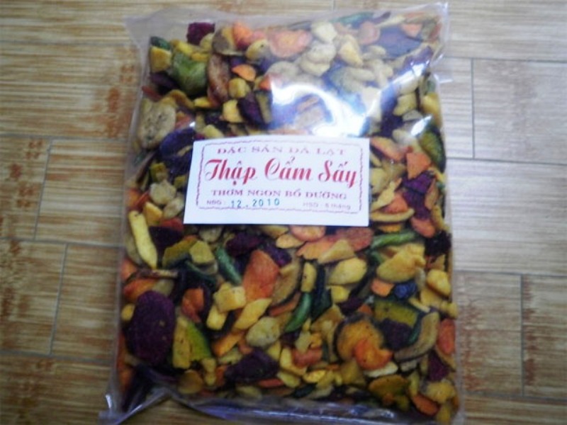 Thập cẩm sấy giòn là món ăn không thể bỏ qua khi đến Đà Lạt. Thập cẩm sấy được làm từ những loại rau củ quả tươi như: Mít, xoài, chuối, khoai lang, đậu cove...khi sấy vẫn giữ được hương vị tự nhiên của nguyên liệu. Nó có thể là một món quà rất ý nghĩa cho người thân và bạn bè.