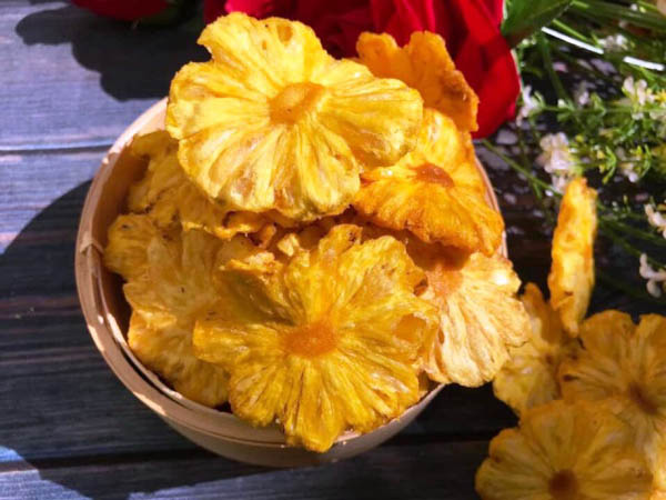 Thơm sấy dẻo được cắt thành khoanh rồi mới sấy nên khi thành phẩm, mỗi miếng thơm là 1 khoanh thơm nguyên vẹn như hình bông hoa.